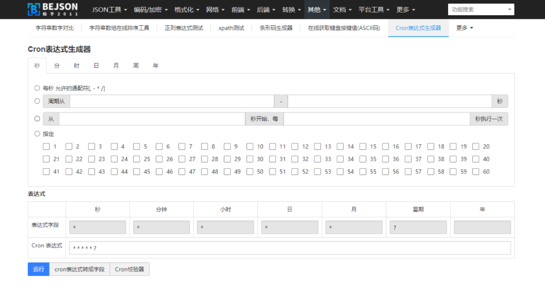 BEJSON站内提供了很多实用的小工具。像我最近正在开发一个调度任务的配置平台,免不了要写Cron表达式,但搞过定时任务的都知道Cron表达式可不太好记,而且用的频率相对不高,花太多时间在死记硬背上就有点不值当。这个在线工具提供了图形化界面,只要我们输入想要定时执行的周期,就可以自动生成Cron表达式。
